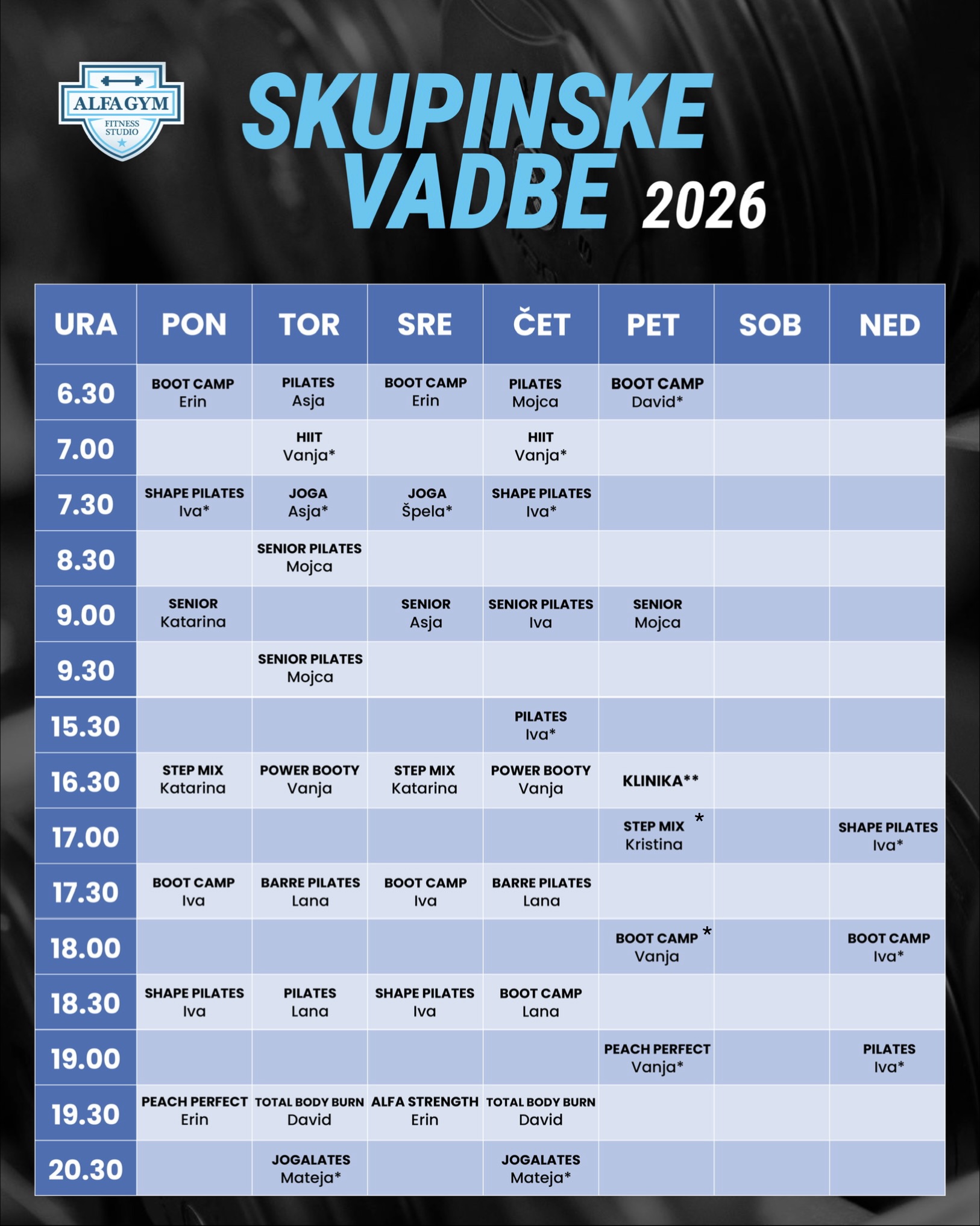 V primeru DODATNE OZNAKE * so za to vadbo potrebne NAJMANJ 4 REZERVACIJE.